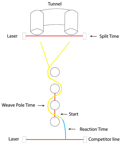 Our system integrates with an extremely robust database. Designed from the ground up and customized to deliver comparative analysis of one dog’s performance to another; or compared to its own past performance. You can filter by height, age, sex, class, breed (including mix breeds), and course surface. Here is some video of Novice dogs using the "E Poles" weaves poles for the first time.