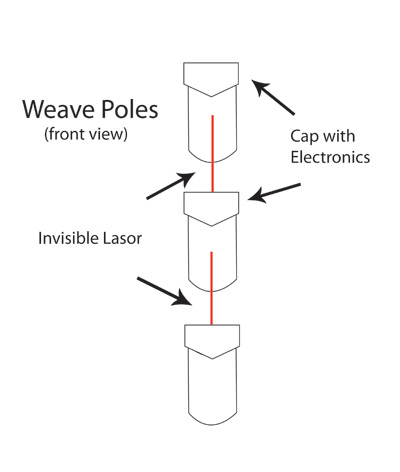 We have a wireless infrared laser that is set into the E Pole™ so the start and finish of the weave poles can be measured. Data is then transmitted to our system and integrated for analysis. The E Pole’s™ only visual difference is the cap on the top of the pole, (for the microprocessor and wireless components), and a housing in the poles that holds the laser.